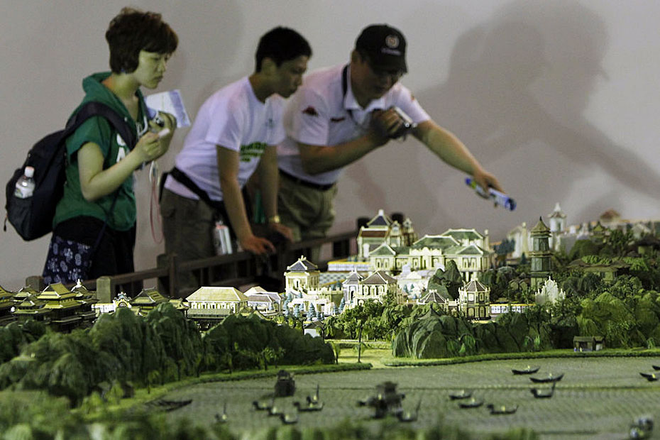 5月4日,游客在參觀縮微版“圓明園”。近日,一座“全景式巨型立雕圓明園”在上海世博會世界貿(mào)易中心協(xié)會館亮相。這座縮微版的“圓明園”以1比150的比例制作而成,再現(xiàn)了全盛時期的圓明園雄偉壯觀的全景。圖片來源:新華網(wǎng) 裴鑫 攝
