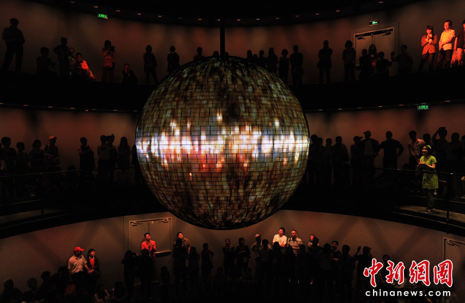 德國(guó)館的高潮就是它的最后部分“動(dòng)力之源”?梢匀菁{600人的動(dòng)力之源大廳圓形環(huán)廊是一個(gè)圓錐形空間,中間懸掛著一個(gè)重達(dá)1.5噸、直徑達(dá)3米的巨大金屬球,四周則有一圈供游客駐足的走廊。黑漆漆的大廳里,兩個(gè)虛擬主持人邀請(qǐng)觀眾同時(shí)大聲吶喊。隨著吶喊聲的加大,動(dòng)力球慢慢擺動(dòng)起來,聲音越大擺動(dòng)幅度越大,甚至繞圈飛行。圓球表面40萬根發(fā)光的LED管,逐漸閃現(xiàn)出德國(guó)人對(duì)未來城市生活的暢想畫面。這是一場(chǎng)7分鐘的互動(dòng)體驗(yàn)。在這里觀眾才是主角。中新網(wǎng)記者 王紅綱 攝