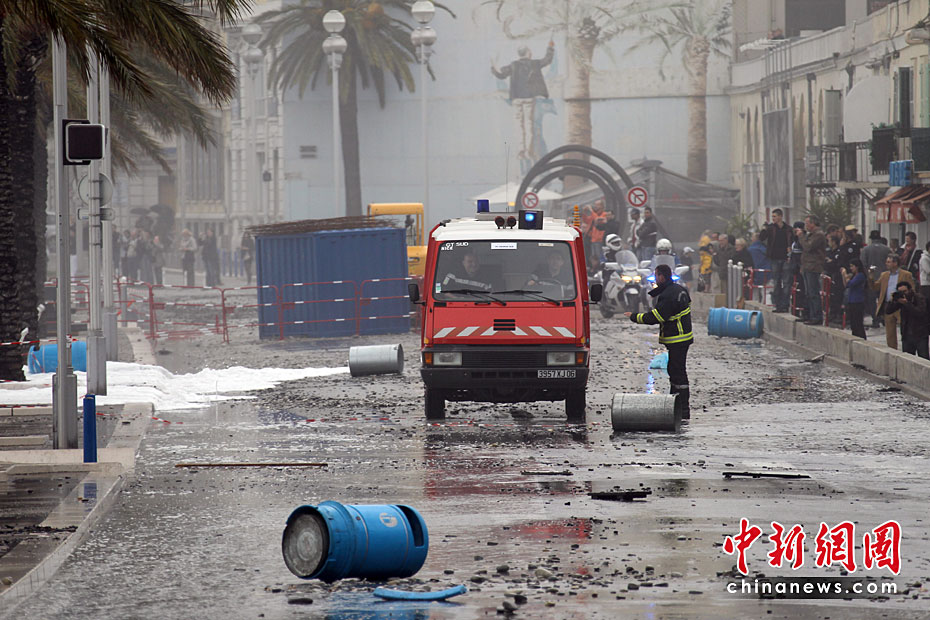近日,在法國南部城市尼斯,巨浪襲擊城市的海岸后造成城市道路癱瘓。法國南部部分地區(qū)遭遇大風和巨浪,使當?shù)亟煌ê凸╇娛艿讲煌潭鹊挠绊。圖片來源:中國新聞網(wǎng)
