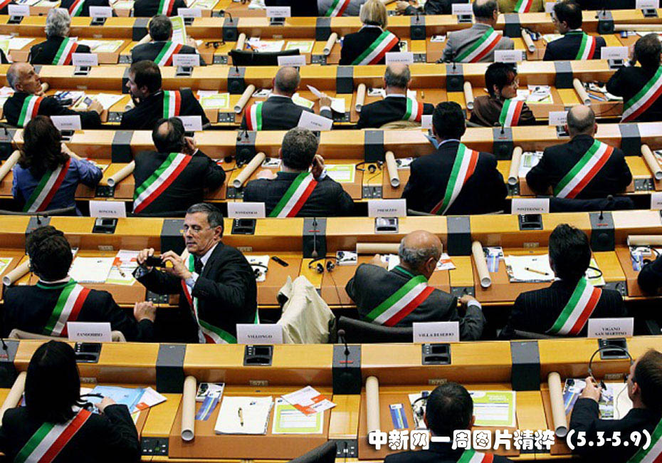5月4日周二,在布魯塞爾召開的歐洲議會市長會議上,一名市長為同事們拍照。
