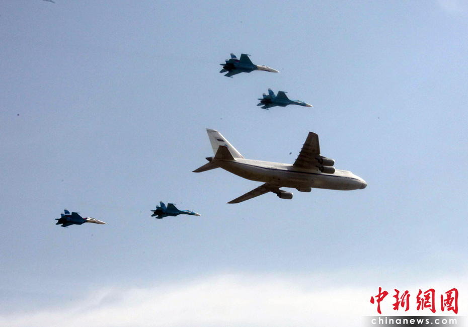 5月9日,俄羅斯在莫斯科紅場舉行盛大的閱兵式,慶祝衛(wèi)國戰(zhàn)爭勝利65周年。莫斯科時間5月9日上午10點(北京時間9日下午2點)許,閱兵式正式開始。圖為空中梯隊穿越紅場上空接受檢閱。張朔 攝