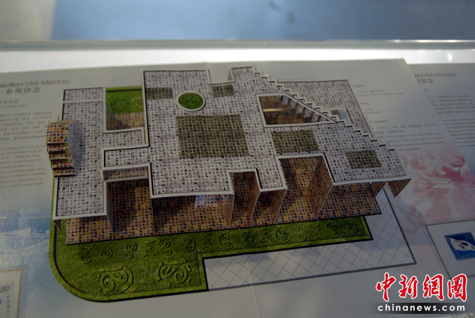 世博園區(qū)內的特許商品店里,折紙場館惟妙惟肖,頗受游客的喜愛。圖為韓國館紙模型。中新網(wǎng)記者 吳歆 攝
