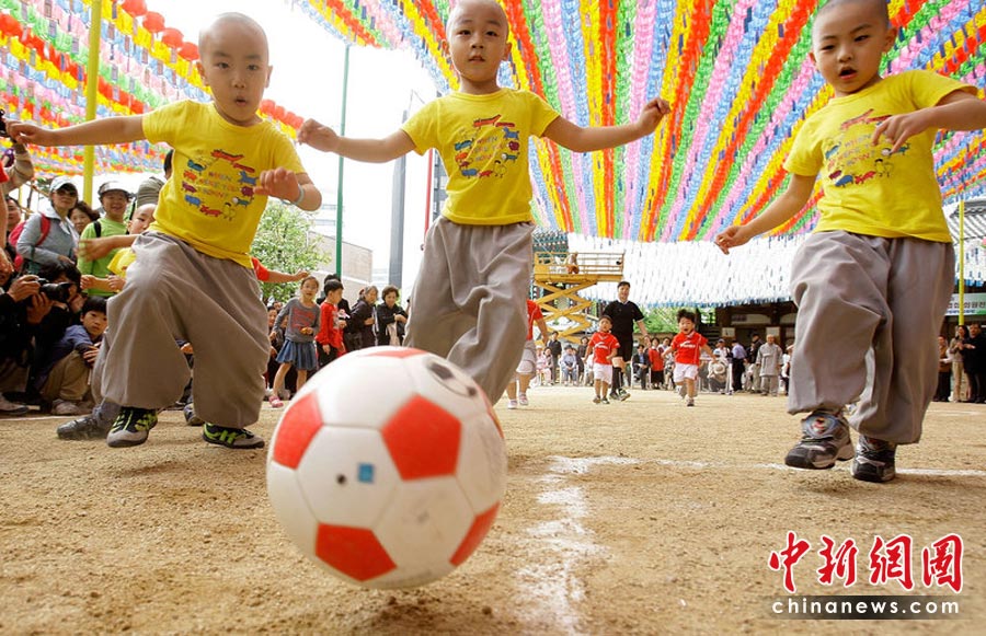 2010年5月15日,韓國首爾曹溪寺院舉行了兒童足球賽,一群四五歲的孩子和小和尚參加了這場足球友誼賽。這場比賽是佛誕節(jié)活動(dòng)的一部分,也是為了迎接2010世界杯足球賽的到來。Chung Sung-Jun