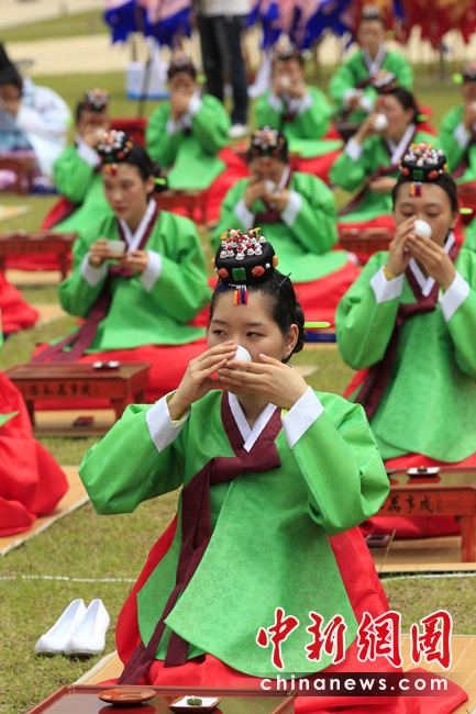 5月17日,韓國首都首爾慶熙宮舉行了第38屆成人禮儀式。為了慶祝青年人年滿20歲,同時也為了提高他們身為成人的責(zé)任感。圖為韓國少女在成人儀式上喝酒。圖片來源:中國新聞網(wǎng)