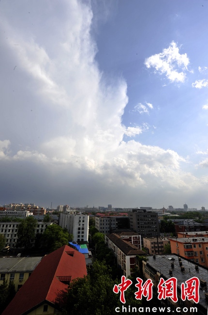 5月18日16時(shí)許,伴隨陣陣?yán)茁暰┏峭唤荡笥,降雨過(guò)后東部天空依然籠罩著烏云,而西邊卻已放晴。中新網(wǎng)記者 金碩 攝