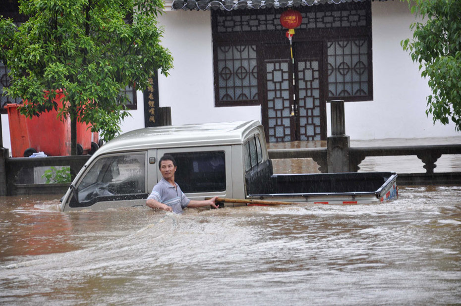 2010年5月18日,江西婺源遭受暴雨洪澇災(zāi)害,在婺源縣城,一輛汽車和車主被洪水圍困。單長(zhǎng)華 攝 (圖片來源:新華網(wǎng))
