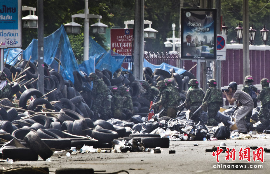 19日,發(fā)起驅(qū)散行動的泰國軍方突破了反政府“紅衫軍”示威者在曼谷市中心所筑路障,進(jìn)入其營地內(nèi),雙方爆發(fā)槍戰(zhàn)。目擊者稱,已有至少9人受傷,多數(shù)是被槍擊中。