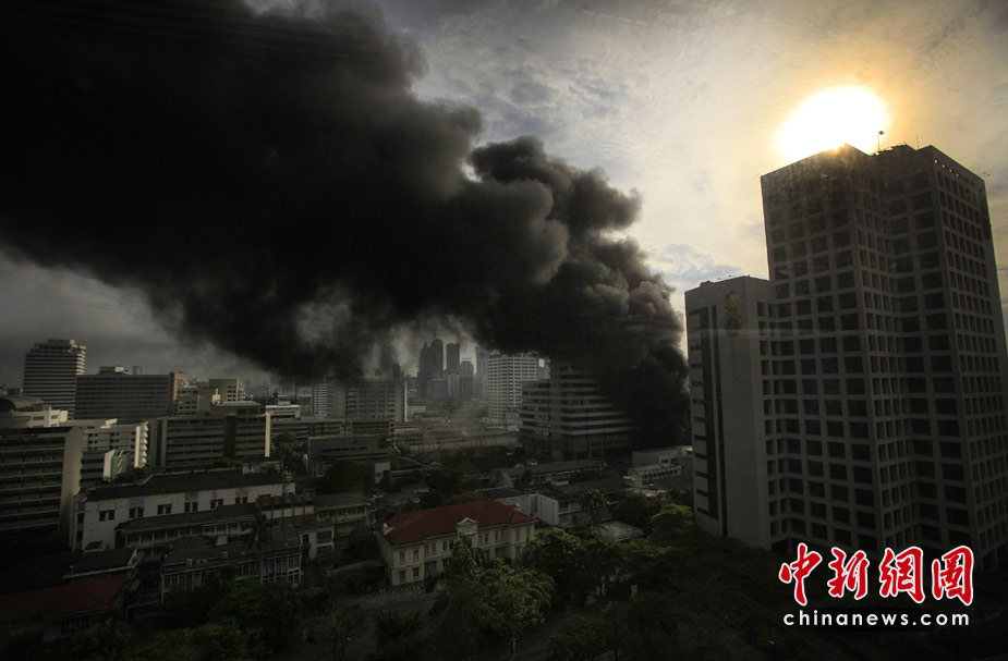 19日,發(fā)起驅散行動的泰國軍方突破了反政府“紅衫軍”示威者在曼谷市中心所筑路障,進入其營地內(nèi),雙方爆發(fā)槍戰(zhàn)。目擊者稱,已有至少9人受傷,多數(shù)是被槍擊中。 圖為“紅衫軍”成員在曼谷一所醫(yī)院附近集會并燃燒輪胎。