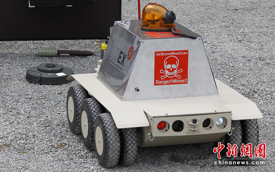 當?shù)貢r間5月18日,德國南部哈默爾堡舉行了歐洲軍用機器人大賽。歐洲各國軍用機器人在大賽上一展身手。圖片來源:中國新聞網(wǎng)