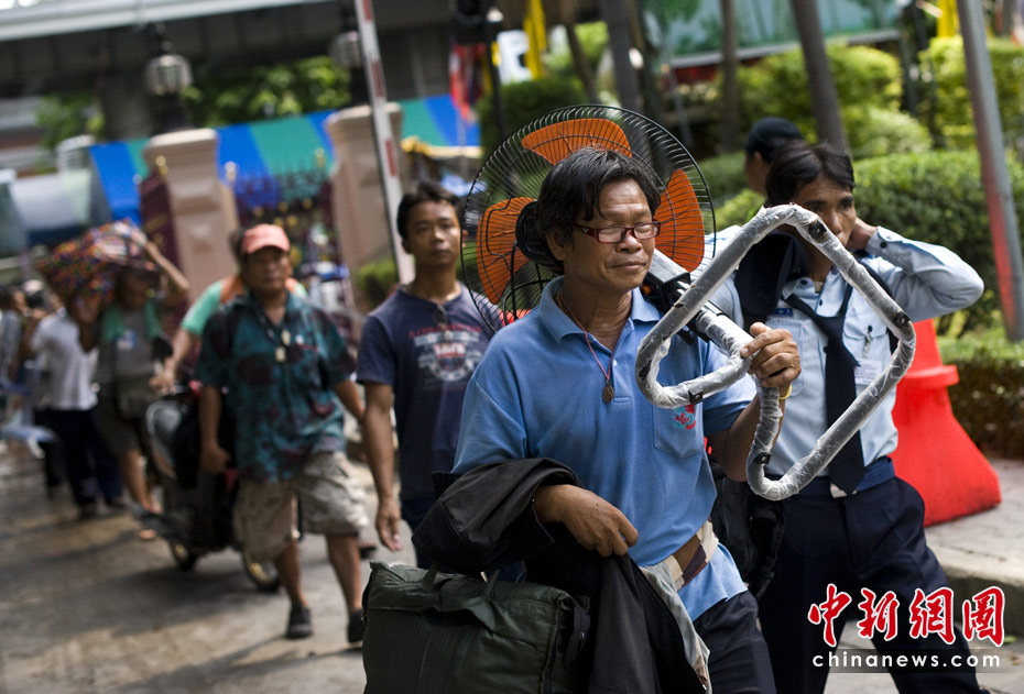 5月20日,數(shù)千名結(jié)束集會(huì)的外地“紅衫軍”示威者在曼谷拉差巴頌地區(qū)接受登記和安全檢查后,乘坐政府安排的車(chē)輛返回家鄉(xiāng)。
