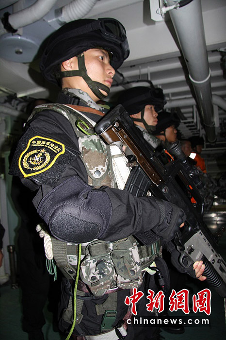 3月7日,新加坡海峽特戰(zhàn)隊(duì)員在船艙中集合。胡軍 攝