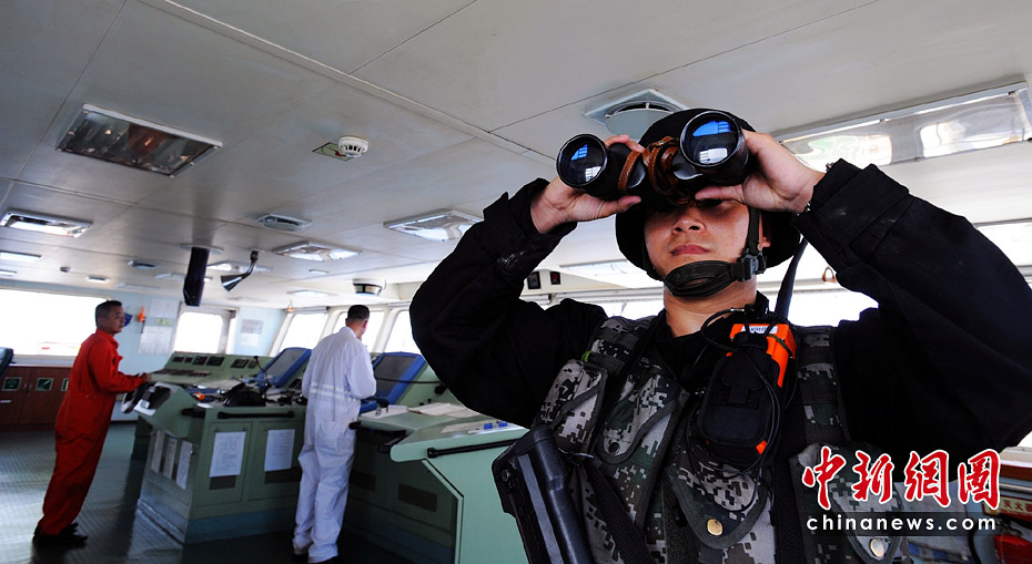 4月13日上午9時(shí),特戰(zhàn)隊(duì)員在駕駛室瞭望警戒。船長戴濤說,有特戰(zhàn)隊(duì)員在身邊,即使航行在海盜猖獗的亞丁灣海域,心里也特別踏實(shí)。江山 攝