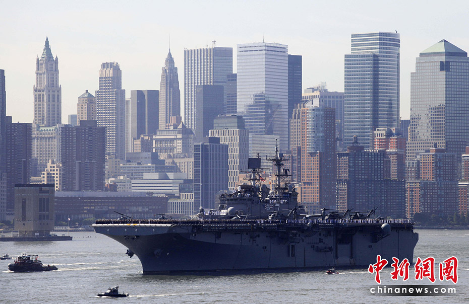 當?shù)貢r間5月26日,美國第23屆紐約艦隊周開幕,包括“硫磺島”號兩棲攻擊艦在內(nèi)的11艘參加艦隊周活動的軍艦由南向北在哈得孫河面上游弋。紐約民眾將以停靠在曼哈頓哈得孫河86號碼頭的“無畏號”航母博物館為中心,展開為期一周的慶祝和紀念活動。圖片來源:中國新聞網(wǎng)