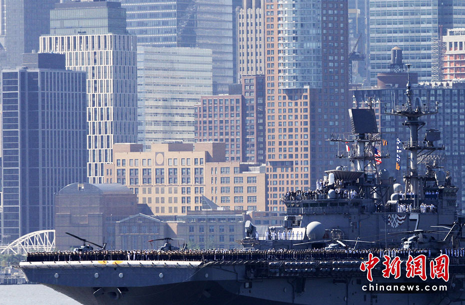 當(dāng)?shù)貢r間5月26日,美國第23屆紐約艦隊周開幕,包括“硫磺島”號兩棲攻擊艦在內(nèi)的11艘參加艦隊周活動的軍艦由南向北在哈得孫河面上游弋。紐約民眾將以?吭诼D哈得孫河86號碼頭的“無畏號”航母博物館為中心,展開為期一周的慶祝和紀(jì)念活動。圖片來源:中國新聞網(wǎng)