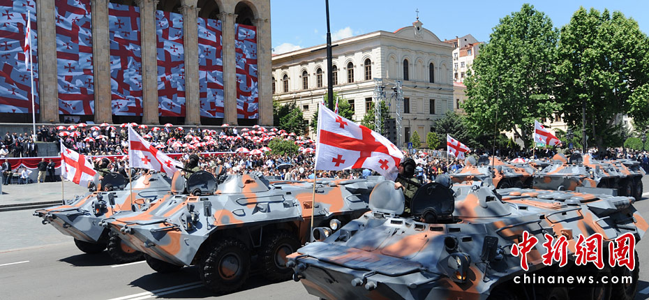 5月26日,在格魯吉亞首都第比利斯,受閱部隊(duì)從議會(huì)大廈前走過。當(dāng)日,格魯吉亞在第比利斯舉行慶祝格獨(dú)立日閱兵典禮,格總統(tǒng)薩卡什維利在議會(huì)大廈前檢閱軍隊(duì)并發(fā)表演講。圖片來源:中國(guó)新聞網(wǎng)