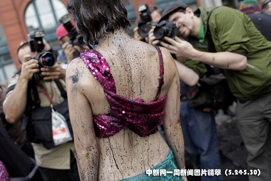 28日(周五),美國環(huán)保主義者在紐約曼哈頓的一家加油站前,身上涂灑黑色顏料,以此抗議墨西哥灣原油不斷泄露。