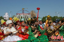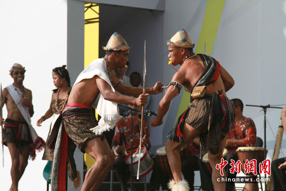 5月30日,馬達加斯加肯特思米諾歌舞團在世博園非洲廣場表演比洛傳統(tǒng)儀式,逼真的神態(tài)、激情的表演,博得許多參觀者稱贊。當天是馬達加斯加館日,世博中心內(nèi)舉行了其國家館日活動,馬方和中方代表共同出席。中新社記者 殷春永 攝