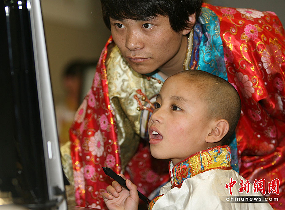 5月31日,玉樹地震孤兒多杰仁青在老師的指導(dǎo)下在北京國(guó)家圖書館體驗(yàn)新開通的少兒數(shù)字圖書館,迎接六一兒童節(jié)。這批玉樹孤兒共23名,于5月23日抵京,由“中華少年兒童慈善救助基金會(huì)”安置。在北京度過“六一”后,他們還將休整3個(gè)月,待災(zāi)區(qū)情況穩(wěn)定后,中華兒慈會(huì)將與當(dāng)?shù)氐拿裾块T協(xié)商,在征求孤兒本人意愿的基礎(chǔ)上,或讓他們返回原地上學(xué),或者在內(nèi)地長(zhǎng)期居住;饡(huì)將一直支持他們到18歲成人。中新社發(fā) 蘇丹 攝