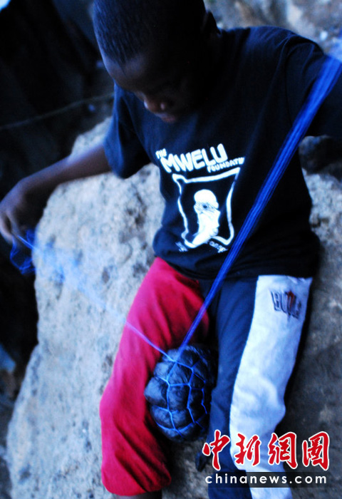 生活在肯尼亞首都內羅畢(Nairobi) Muthare難民營的小孩兒沒有能力買足球、足球鞋,更別說專業(yè)足球隊員穿的成套的球衣了。但是這些沒有給他們對足球運動的喜愛產生任何影響。孩子們從當?shù)氐睦褤靵硭芰峡诖退芰纤槠,自己動手做“足球”?圖片來源:CFP