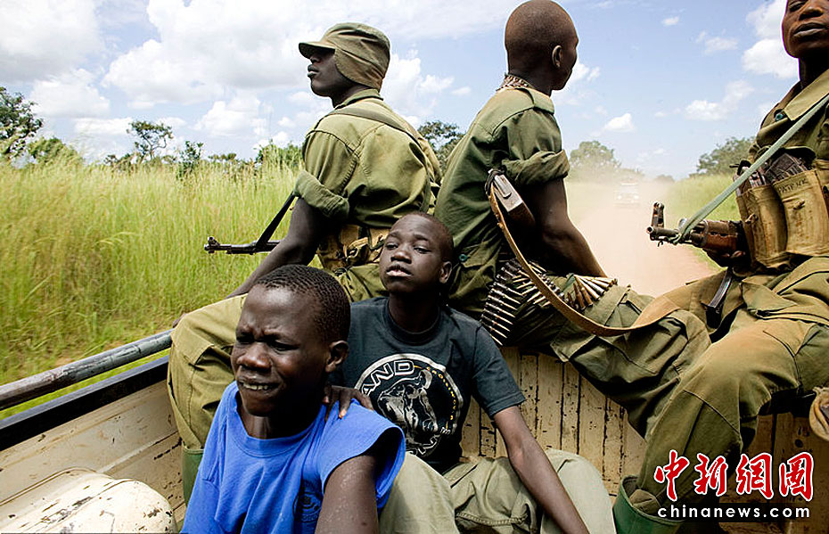 學校放假了,Ronald(左)和Ongom(右)乘卡車回到烏干達帕德爾境內流民營。Ronald(左)和Ongom(右)以前都是兒童軍。在穿越叛軍活動頻繁的地區(qū)時,有士兵保護他們的安全。圖片來源:CFP
