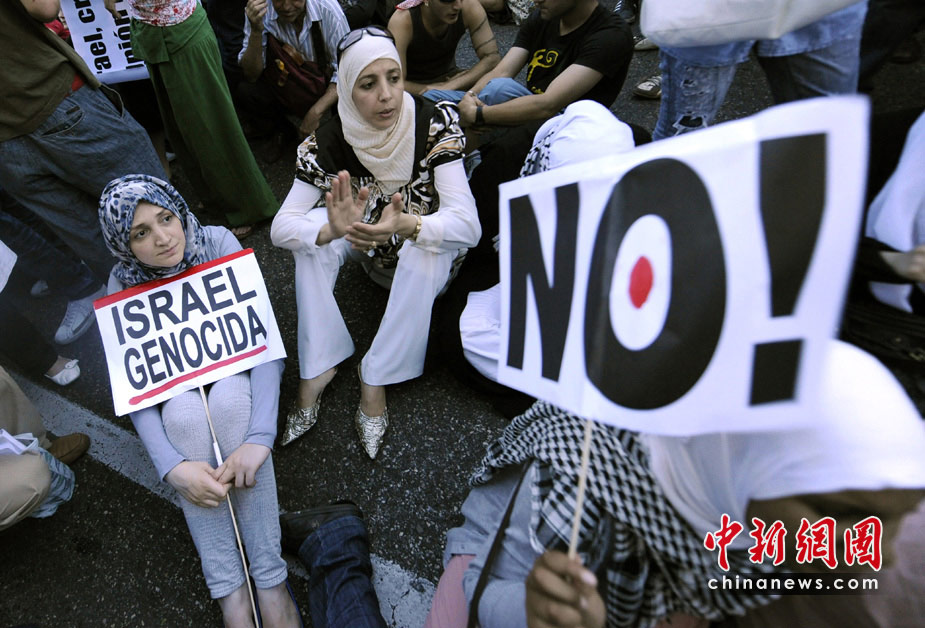 以色列海軍31日對(duì)國(guó)際人道救援船隊(duì)發(fā)動(dòng)襲擊,船上至少有9名支持巴勒斯坦的活動(dòng)人士被以軍打死,眾多國(guó)家和國(guó)際組織紛紛表示“震驚”,多國(guó)民眾走上街頭,對(duì)襲擊事件表示抗議。圖為在西班牙馬德里,民眾在街頭游行抗議。