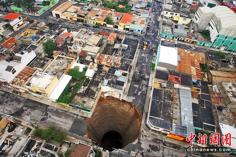 5月31日,受颶風(fēng)“阿加莎”的影響,危地馬拉首都危地馬拉城出現(xiàn)一個深達(dá)60米塌陷洞,有目擊稱一幢3層建筑墜入洞中,至少造成1人死亡。圖片來源:中國新聞網(wǎng)