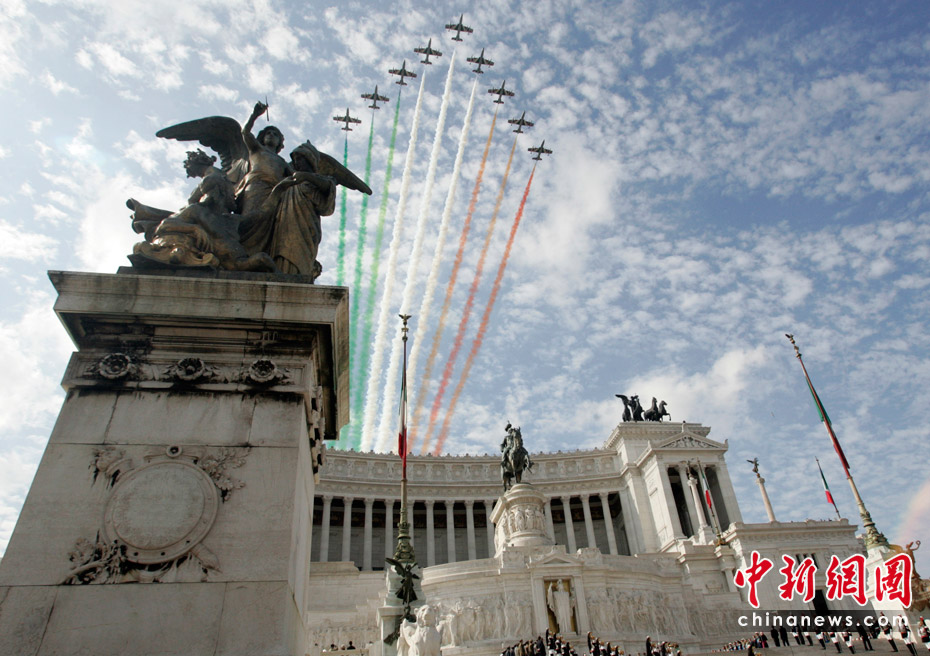 當(dāng)?shù)貢r間6月2日,意大利首都羅馬舉行盛大儀式慶祝國慶日。意大利“三色箭”飛行表演隊在首都上空進行了飛行表演。