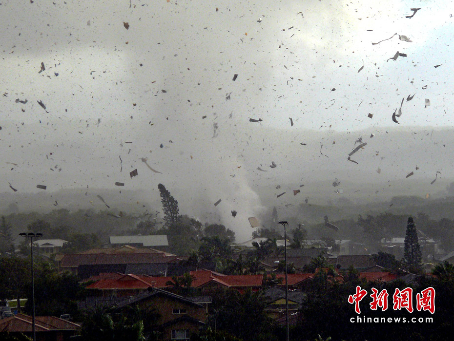 6月3日,澳大利亞新南威爾士州海濱城鎮(zhèn)倫諾克斯黑德遭到龍卷風(fēng)襲擊,大樹被連根拔起,屋頂被掀翻,重型拖車也被拋到半空中。數(shù)千所民居停電。一共有12所房屋在這場龍卷風(fēng)中被摧毀,6人受傷,傷勢不重。所幸沒有人員死亡的報(bào)告。圖片來源:中國新聞網(wǎng)