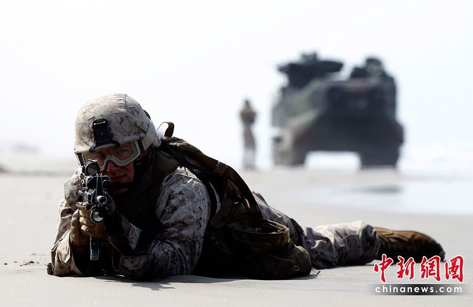 當?shù)貢r間6月4日,約5000名水兵和陸戰(zhàn)隊員在美國加利福尼亞州舉行了代號為“黎明突擊”的搶灘登陸軍事演習。圖片來源:中國新聞網(wǎng)