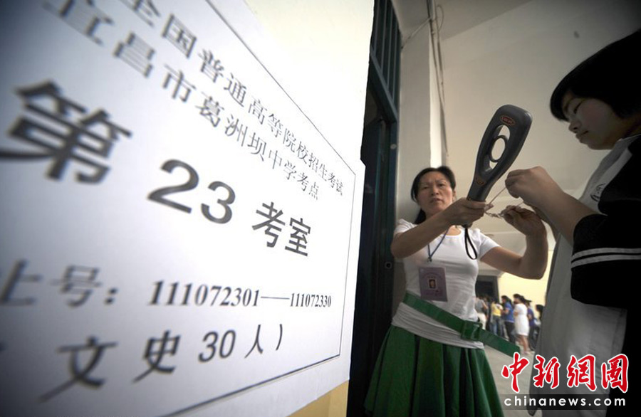 2010年全國高考6月7日日拉開大幕,957萬考生走進(jìn)考場。由于報名人數(shù)減少,而招生計劃增加,教育部預(yù)計今年全國高考平均錄取率將會增加近7%。6月6日下午,參加2010年高考的湖北宜昌考生走進(jìn)葛洲壩中學(xué)考點熟悉考場,進(jìn)場前,監(jiān)考老師手持金屬探測儀器對考生一一進(jìn)行認(rèn)真的安全檢查。劉曙松/CFP