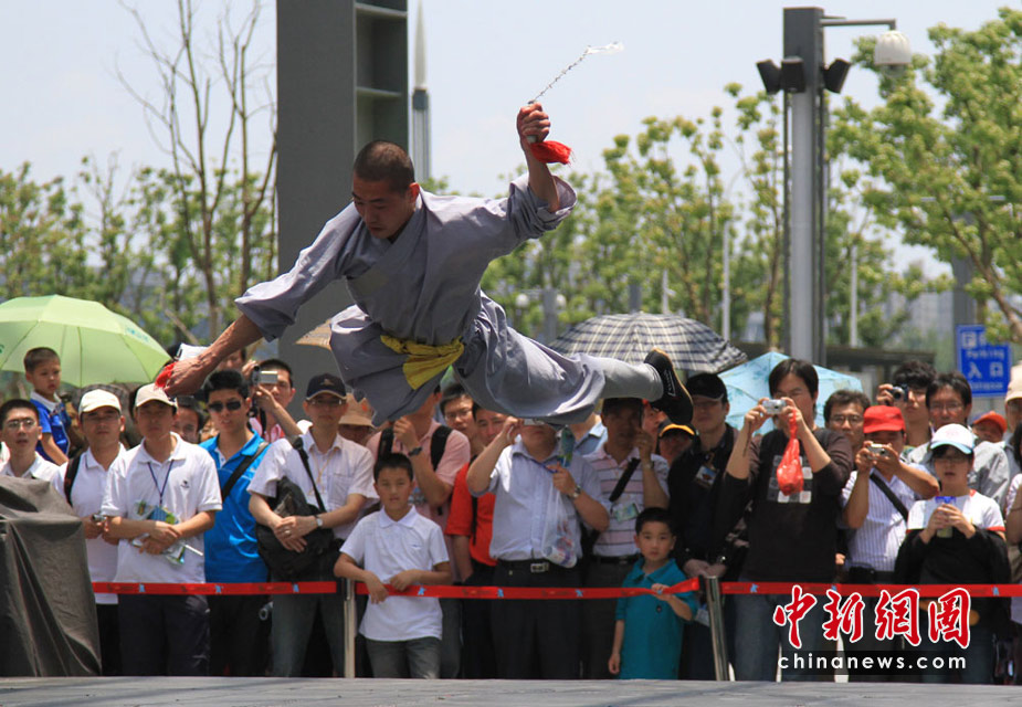 自5月1日開始,上海世博園D片區(qū)綜藝廣場每天都有少林寺功夫展演,受到世博參觀者的熱捧。中新社記者 殷春永攝