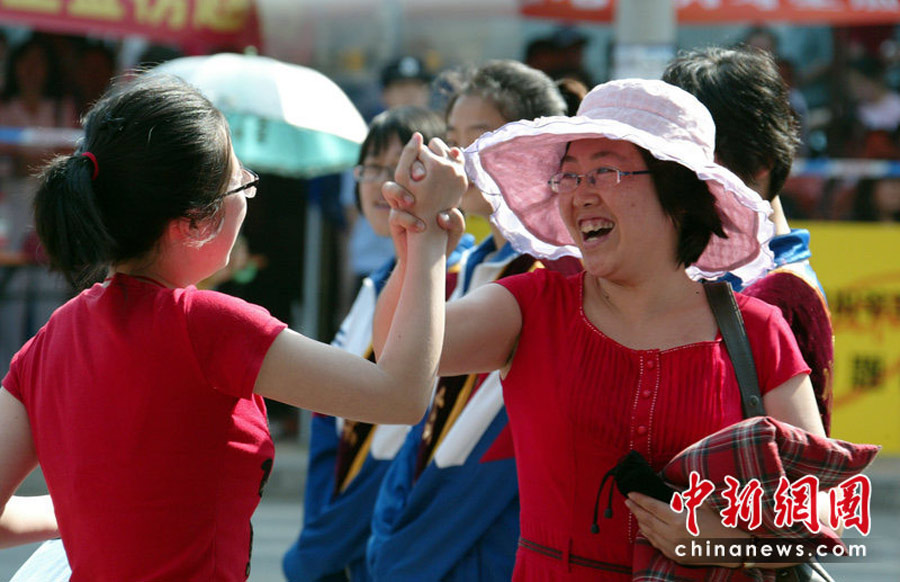 6月7日,為期兩天的2010年普通高等學(xué)校招生全國(guó)統(tǒng)一考試開(kāi)考,全國(guó)將有957萬(wàn)考生走進(jìn)考場(chǎng)。圖為高考第一天,遼寧丹東一中考場(chǎng)外的老師鼓勵(lì)準(zhǔn)備參加考試的學(xué)生獲得好成績(jī)。陳浩 攝