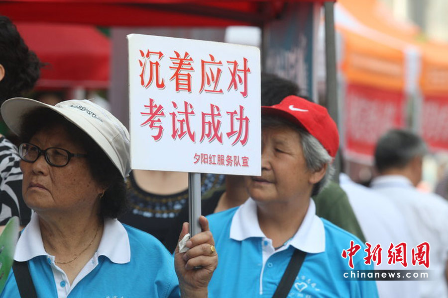 6月7日,為期兩天的2010年普通高等學校招生全國統(tǒng)一考試開考,全國將有957萬考生走進考場。圖為在哈爾濱一考點外,夕陽紅服務(wù)隊的老人舉起牌子鼓勵考生。小剛 攝