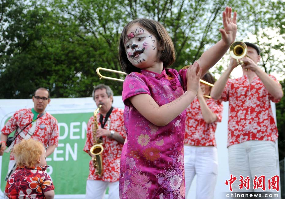 當(dāng)?shù)貢r間2010年6月6日,英國倫敦舉行卡姆登綠色市集(Camden Green Fair),這是英國倫敦每年環(huán)保領(lǐng)域的“重頭戲”。本屆市集的主旨是要喚起大眾對環(huán)境問題的關(guān)注,選擇更加可持續(xù)發(fā)展的生活方式。據(jù)活動主辦方預(yù)計,本屆市集將吸引來自英國各地和世界各國的2萬多人參加。圖為一名英國小女孩兒身著中式旗袍翩翩起舞,宣傳環(huán)保。Fiona/攝 Fiona 馬小剛/文