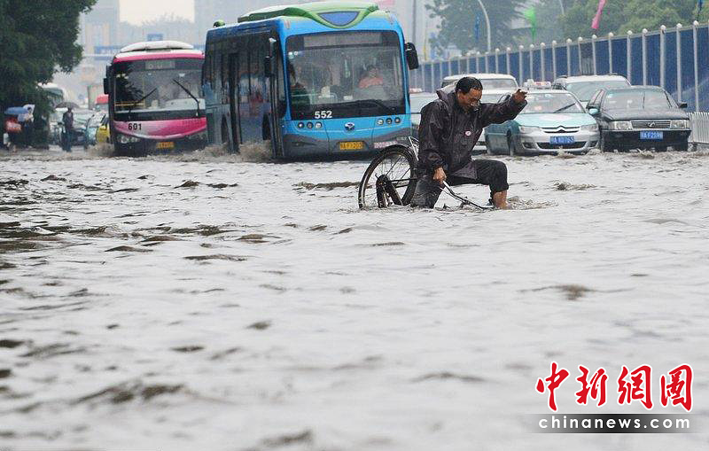 6月8日,武漢持續(xù)降雨,武昌徐東大街汪家墩段,300多米路面積水,最深處超過(guò)半米,車輛只得緩慢涉水而行。承影/CFP