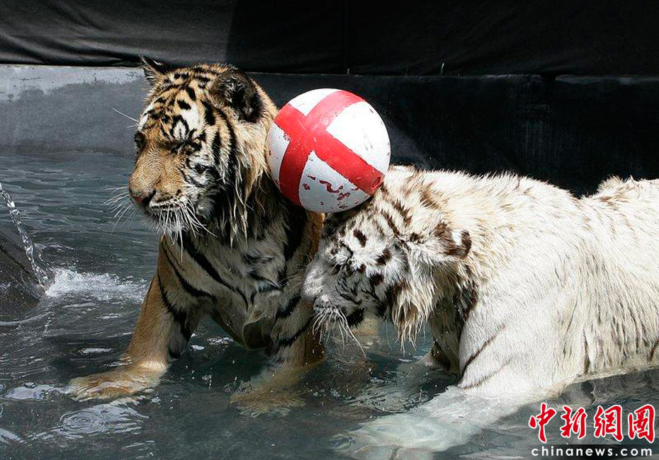 2010年6月7日,美國(guó)南卡羅來(lái)納州美特爾海灘,在世界杯即將開(kāi)幕之際,一歲的小白虎Sundaram和孟加拉虎Mukti率先在水里上演了一出足球大戲。英格蘭隊(duì)首戰(zhàn)將對(duì)陣美國(guó)隊(duì),因此足球外側(cè)也被印上了英格蘭旗的標(biāo)志。cfp