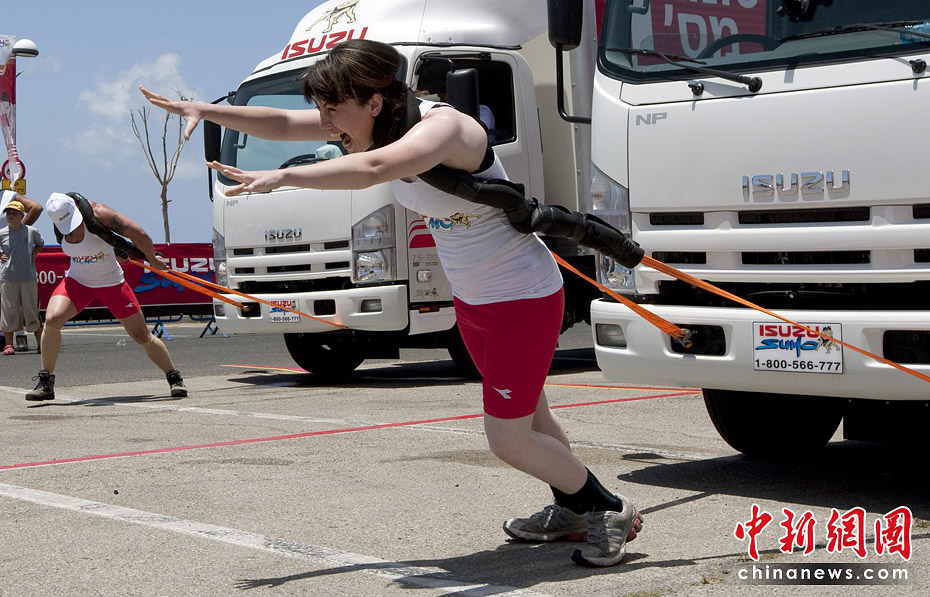 6月8日,以色列在海濱城市特拉維夫舉行了拉卡車大賽。比賽要求將一臺7.5噸的卡車?yán)?0米以外,用時(shí)最短者為勝者。該項(xiàng)賽事不但吸引了世界上眾多男性大力士,更有許多女性大力士出戰(zhàn)。圖片來源:中國新聞網(wǎng)