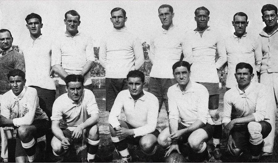 圖為首屆冠軍隊(duì)烏拉圭。第一屆世界杯參賽隊(duì)只有13支,包括4支歐洲球隊(duì)、8支南美洲球隊(duì)以及一支來自美國的代表隊(duì),不過這屆賽事體現(xiàn)了當(dāng)時(shí)世界足壇的最高水平。東道主烏拉圭隊(duì)4比2戰(zhàn)勝阿根廷奪得首屆冠軍,首都蒙得維的亞慶祝球隊(duì)奪冠的活動(dòng)持續(xù)了幾天幾夜。為了紀(jì)念這場(chǎng)勝利,決賽后的第二天(7月31日)被定為全國性節(jié)日。