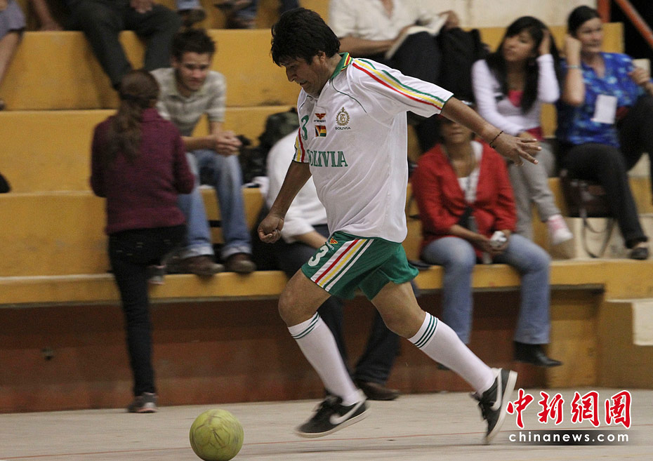 圖為2009年11月1日,玻利維亞總統(tǒng)莫拉萊斯當(dāng)日在拉巴斯代表玻利維亞總統(tǒng)隊和巴西大使館隊踢了一場足球比賽。結(jié)果玻利維亞總統(tǒng)隊以10-2的比分獲勝。