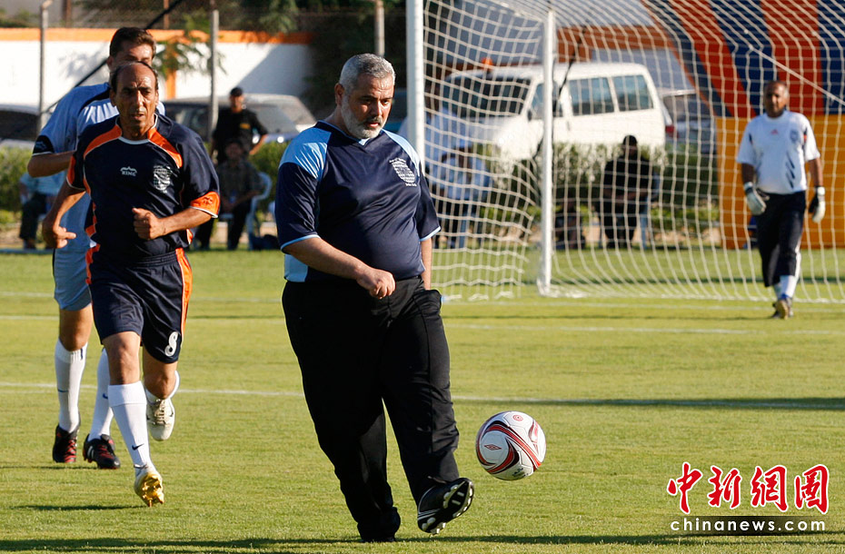 圖為2009年8月7日,加沙,巴勒斯坦伊斯蘭抵抗運(yùn)動(哈馬斯)領(lǐng)導(dǎo)人哈尼亞在雅穆克體育場重新開放的儀式上大秀足球球技。