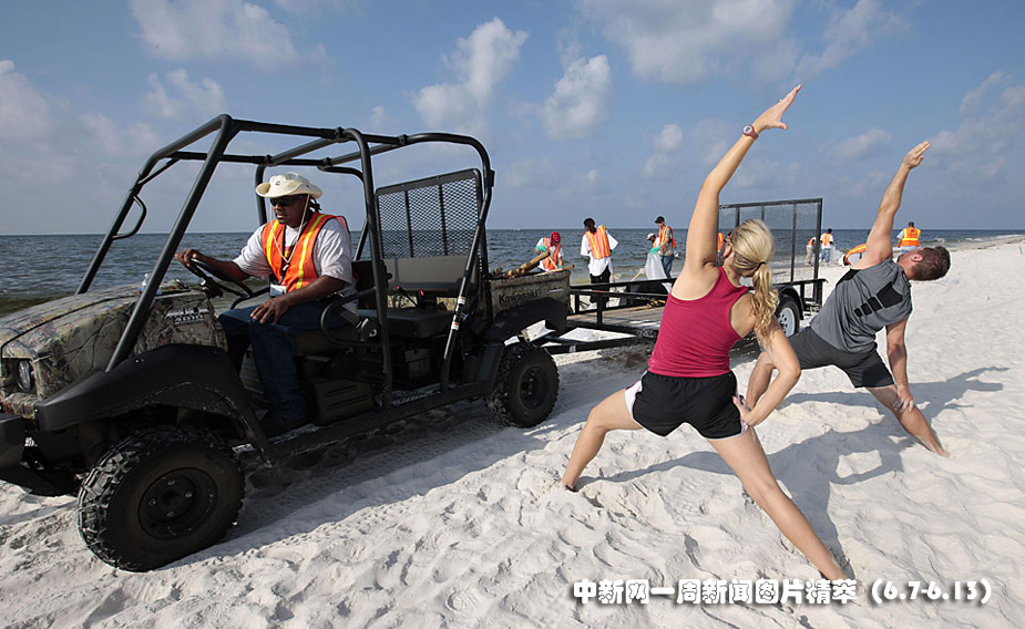 周三(9日)在美國(guó)阿拉巴馬州奧蘭治海灘,英國(guó)石油公司(BP)雇傭的清理工在清理焦油球,來(lái)自休斯頓的霍利戴(Kristy Holiday)和芬利(Deets Finley)在一旁練習(xí)瑜珈。