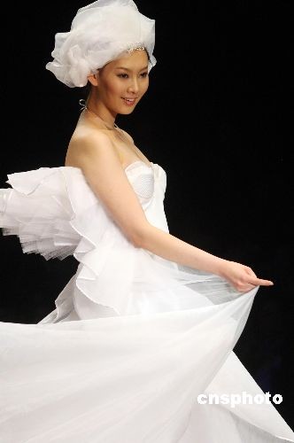 11月7日,“名瑞杯”2008中國婚紗設(shè)計大賽在北京中國國際時裝周上舉行,共有來自中國14個地區(qū)的25份稿件入圍了最后的決賽。參賽作品類型設(shè)計多樣化,有顏色和造型都很獨特的禮服,也有哥特式風(fēng)格的新娘裝等,作品設(shè)計大膽新穎,使用夸張的造型,同時運用以點堆積成面的裝飾手法,在裙身上做出圖案或者肌理,來豐富服裝的整體內(nèi)容,F(xiàn)在的婚紗已經(jīng)不是婚禮的附屬品,而是慢慢的成為時尚亮點,新娘通過選擇婚紗來體現(xiàn)自己的個性和心情,婚紗成為一種特殊的媒介。圖為模特展示婚紗設(shè)計大賽作品。中新社發(fā) 錢興強 攝
