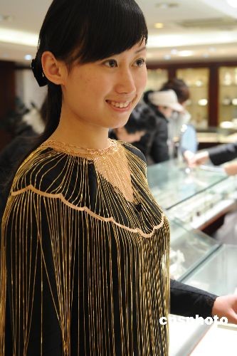 3月10日,在濟南泉城路一家金店,店員向顧客展示一款價值29.8萬元的金質(zhì)披肩。據(jù)店方介紹,這款披肩在國內(nèi)首度亮相,采用18k金機織而成,設(shè)計獨特,十足珍貴。中新社發(fā) 羅波 攝