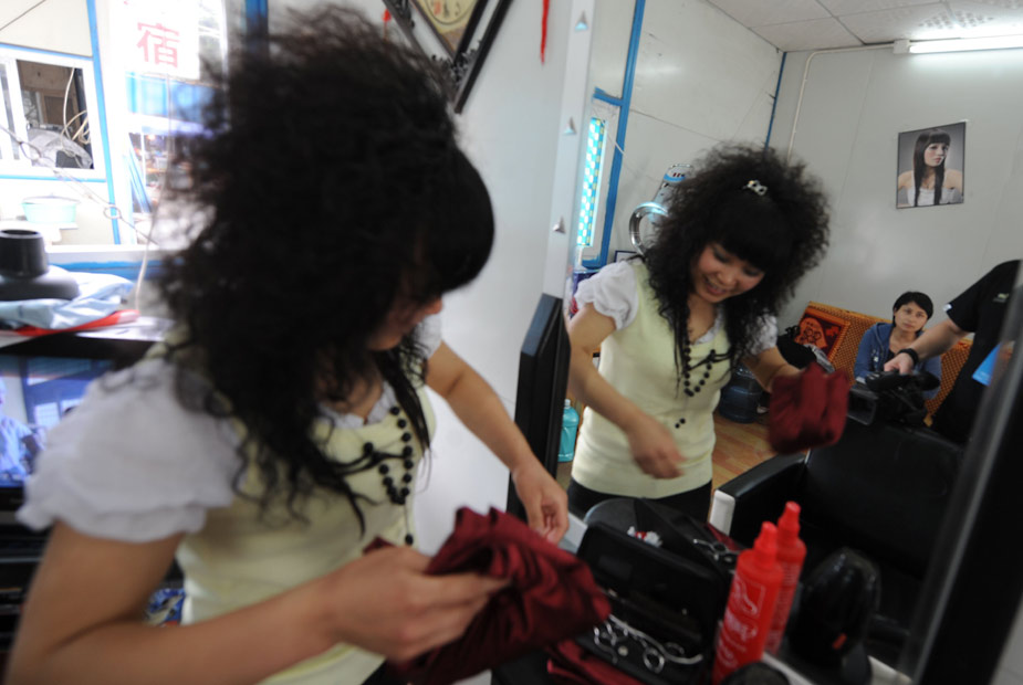 映秀鎮(zhèn)21歲的受災姑娘小云,租借板房開設“80后”美容美發(fā)室,在此地小有名氣。中新社發(fā) 賈國榮 攝