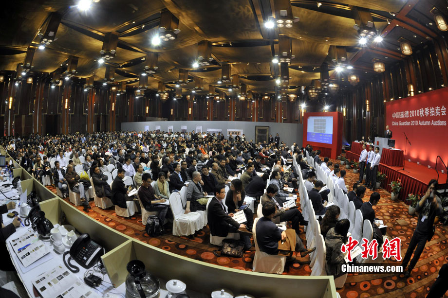 11月20日晚,在中國嘉德2010秋季拍賣會“秋光萬華——清代宮廷藝術(shù)集粹”專場中,王羲之草書《平安帖》以人民幣三億零八百萬成交。圖為該專場拍賣現(xiàn)場。中新社 寇勤 攝