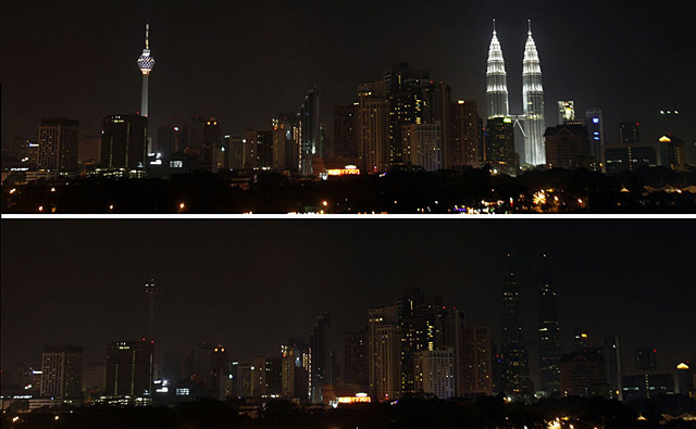 馬來(lái)西亞吉隆坡:3月28日,馬來(lái)西亞吉隆坡的吉隆坡塔(左)和雙子星塔(右)在參與“地球一小時(shí)”熄燈行動(dòng)前(上)和熄燈后(下)的對(duì)比情況。