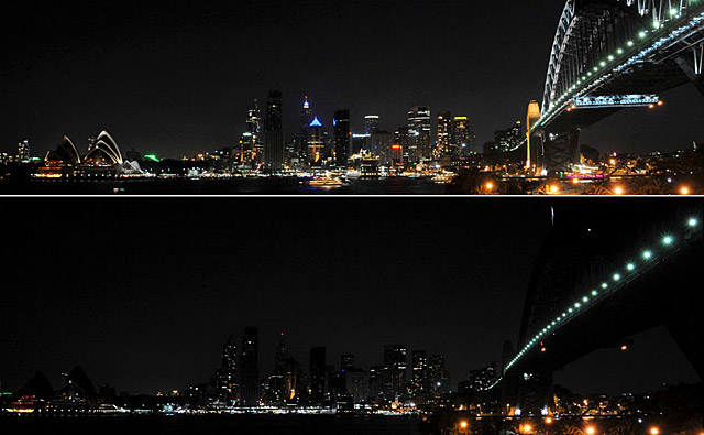 澳大利亞悉尼:3月28日拍攝的拼版照片顯示的是澳大利亞悉尼歌劇院附近建筑在參與“地球一小時”熄燈行動前(上)和熄燈后(下)的對比情況。