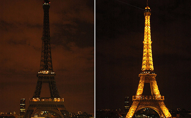 法國巴黎:3月28日,法國巴黎埃菲爾鐵塔熄燈后和亮燈后的照片。