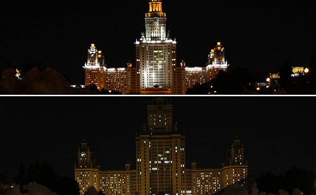 俄羅斯莫斯科:3月28日俄羅斯莫斯科大學(xué)熄燈前(上)和熄燈后(下)的對(duì)比情況。