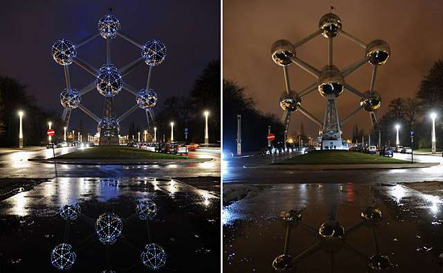 比利時布魯塞爾:3月28日20點30分,比利時首都布魯塞爾的景觀建筑“原子球”在熄滅景觀照明前后的情景對比。